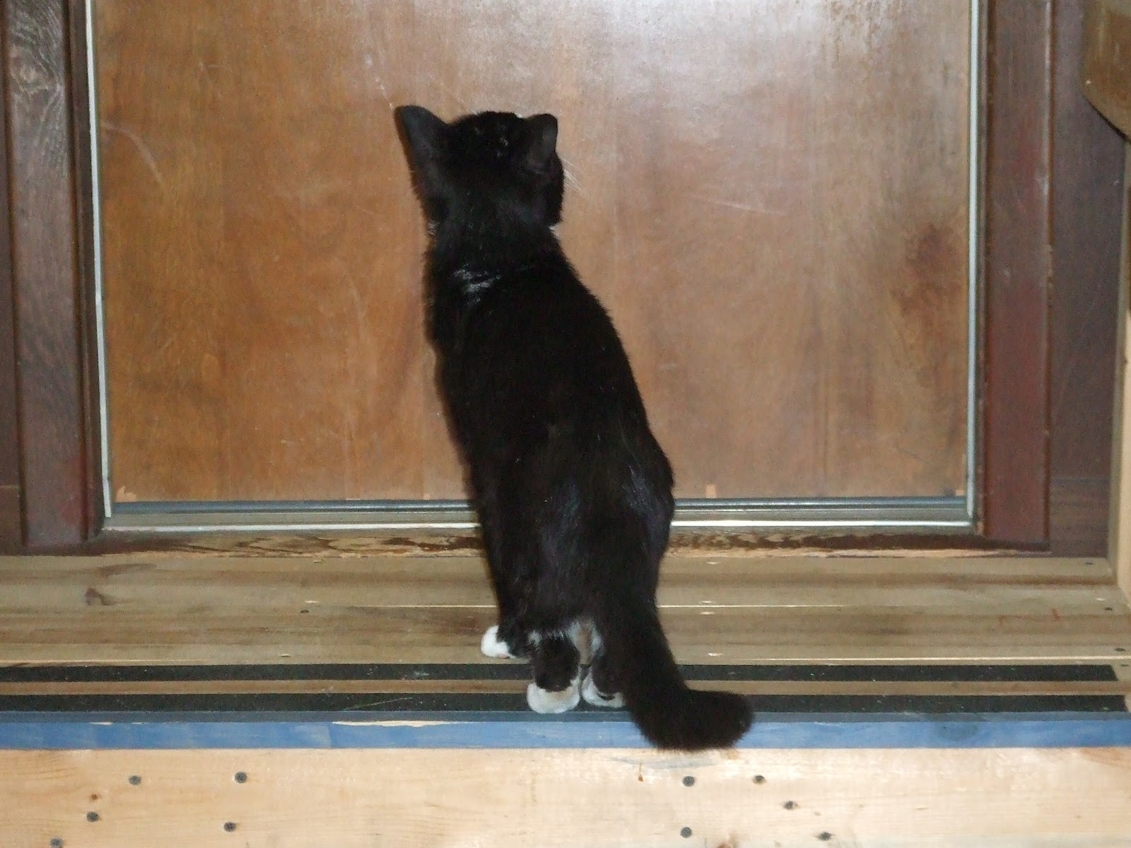 He has started to pay attention to the door into the kitchen.  Once I began going in and out of the house while he was in the garage and he got a glimpse of the interior, he became very curious.  I think it shows he knows about being inside houses.  But he wouldn't be the best indoor candidate right now because he has a terrible marking habit due to his territory battles with his nemesis, the big gray cat.  When he left this morning he jumped over the back fence as usual but paused by a large beach type ball the neighbor kids had left in that yard to give it a spray as if to say "My ball!"  Mercy!